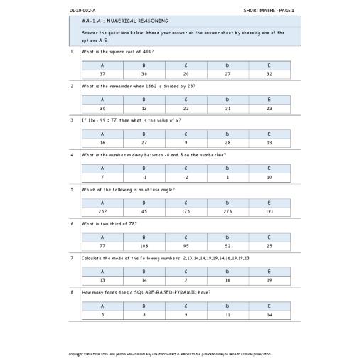 This pack contains one set of CEM Style 11+ mock exams. Each set has a paper ‘A’ and ‘B’ with 80 questions in each test. The papers cover all subjects including vocabulary, non-verbal reasoning, mathematical reasoning, and English as timed sections. All questions are multiple choice questions. Formatted answer sheet is also provided. The details of each test are given below: