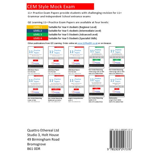 This set of papers is designed and formatted by QE Ltd to assist students sitting the CEM styles entrance exam for Grammar Schools. There is no affiliation, explicit or implied between QE Ltd and CEM/ Durham University. CEM/ Durham University do not provide or share their examination material. This paper is based on questions and format seen in previous years.